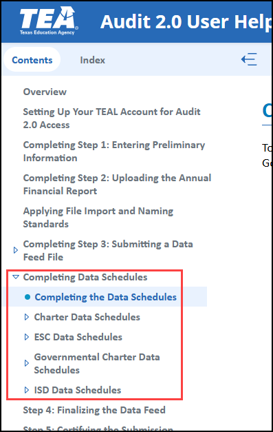 To view instructions about completion of data schedules relevant for your entity type, in the Table of Contents to the left, open the expandable category for your entity type (Charter School, ESC, Governmental Charter School, or ISD).