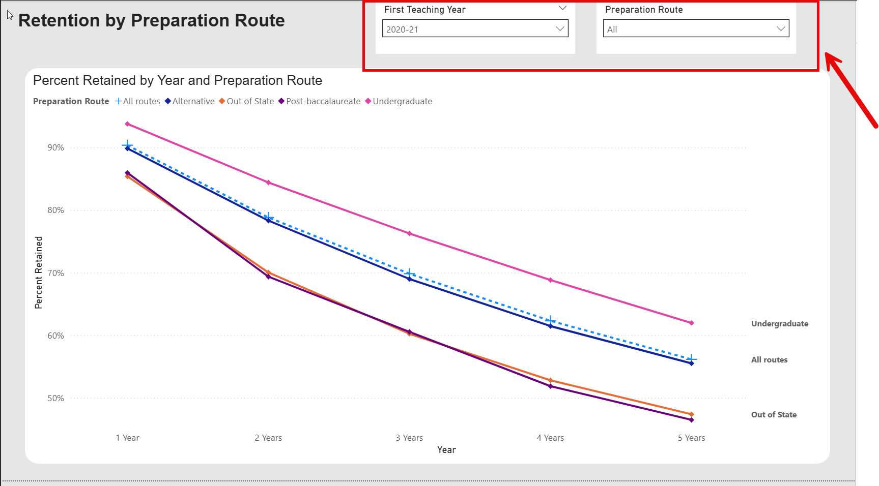 - The dashboard will now display 5 year percentages for teacher retention by preparation route.