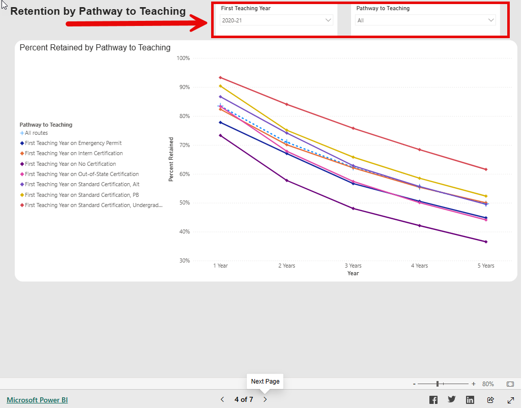 - To see this data in table format, navigate to the “Retention by Pathway to Teaching Table” tab.