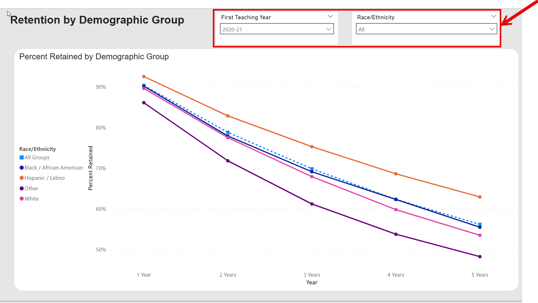 - The dashboard will now display 5 year percentages for teacher retention by Race/Ethnicity