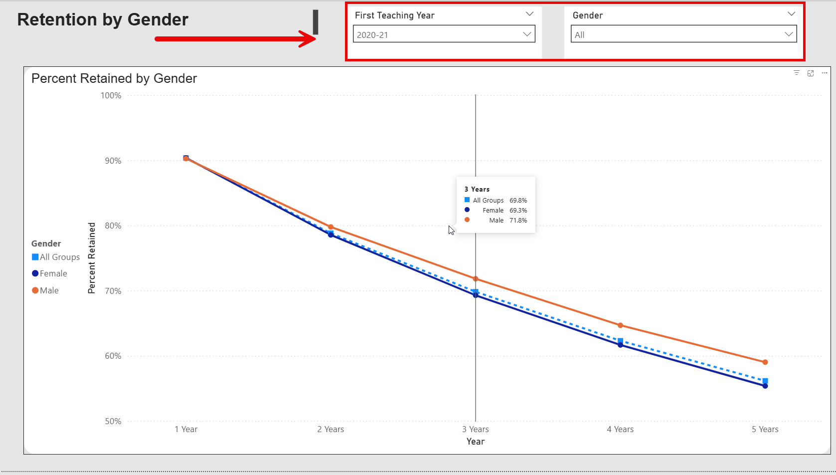 - The dashboard will now display 5 year percentages for teacher retention by Gender.